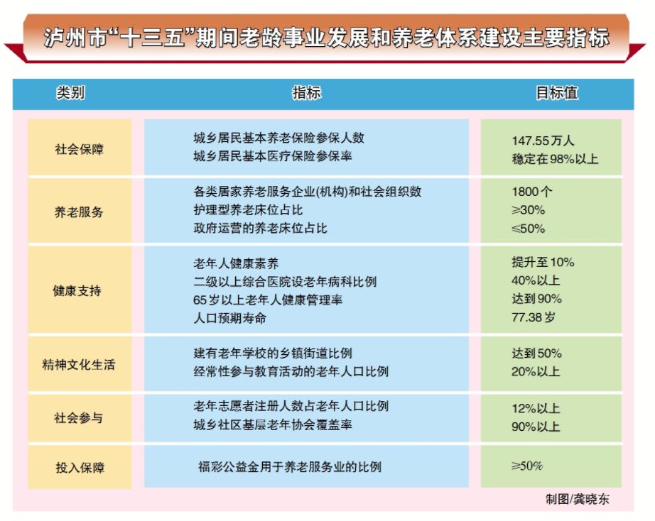 《规划》提出,我市将着力打造具有泸州地方特色的养老品牌,60%以上城市老旧社区完成适老化改造,90%以上的城镇社区建立符合标准的日间照料机构、老年人活动中心,各类居家养老服务企业(机构)和社会组织数达1800个。