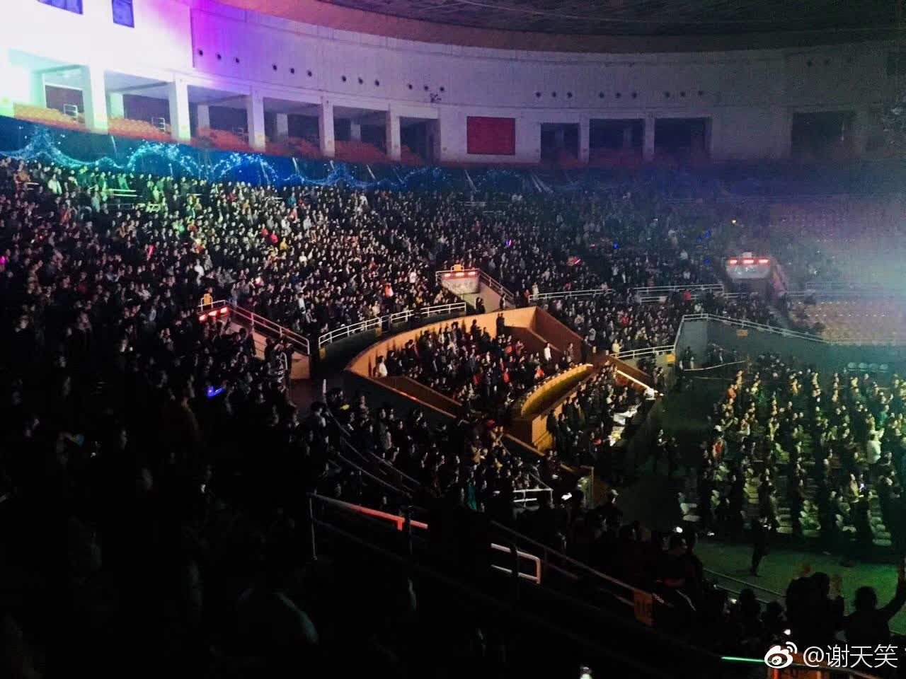 演出八点正式开始,在这之前工体所有能坐人的地方都已坐满了观众。场地灯光熄灭,舞台彩灯亮起,当晚的开场曲是谢天笑第一张专辑《冷血动物》中的第一首歌曲《幸福》,熟悉的旋律响起,幕布升起,大屏幕中,一只巨大的黑色蜘蛛在不断编织白色的网,谢天笑与他的OK King乐队在前,结尾层层递进的“幸福、幸福、幸福,我突然醒了”唱罢后,场内瞬间被点燃,内场的朋友几乎全部起立,“老谢,牛X!”一遍遍响彻整个工体。