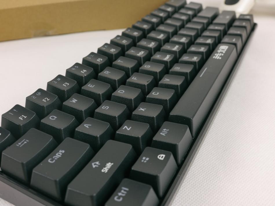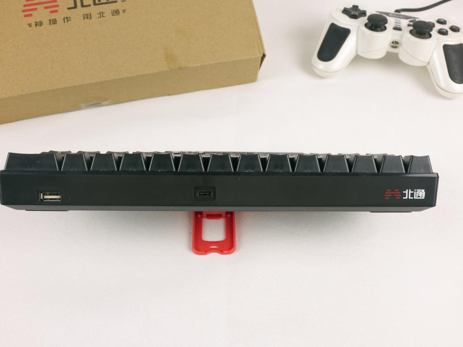 取出键盘后,可以看到北通K1键盘采用的是61键位布局。键位上的白色字体代表键盘二级功能按键,使用时需配合FN键组合使用,这和笔记本键盘上的键位设置类似。61键的布局,在便携性方面是优势,但同时也有不足;与普通的104的键盘相比,对于有数字录入相关需求的用户来,这款键盘需要时间适应。另一点就是,K1键盘的键位间距与普通104键盘的还稍窄,笔者在刚刚开始使用的时候,盲打状态下还会偶尔出现误打状况。可能是笔者与这款键盘还处于“磨合期”的缘故吧。