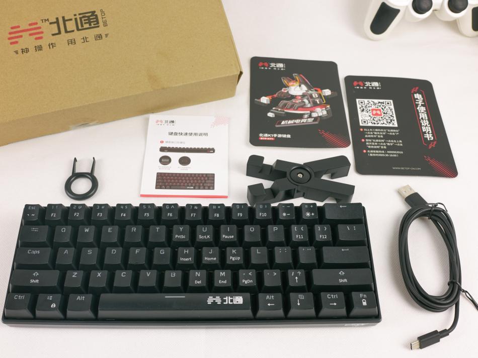 北通K1手游键盘的配件:拔键器、说明书、手机支架、1.5米长Type-c数据线、电子说明书二维码、防尘盖。
