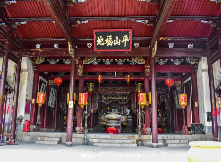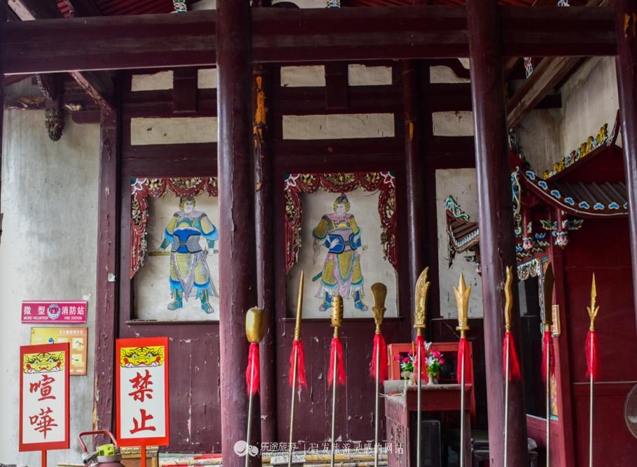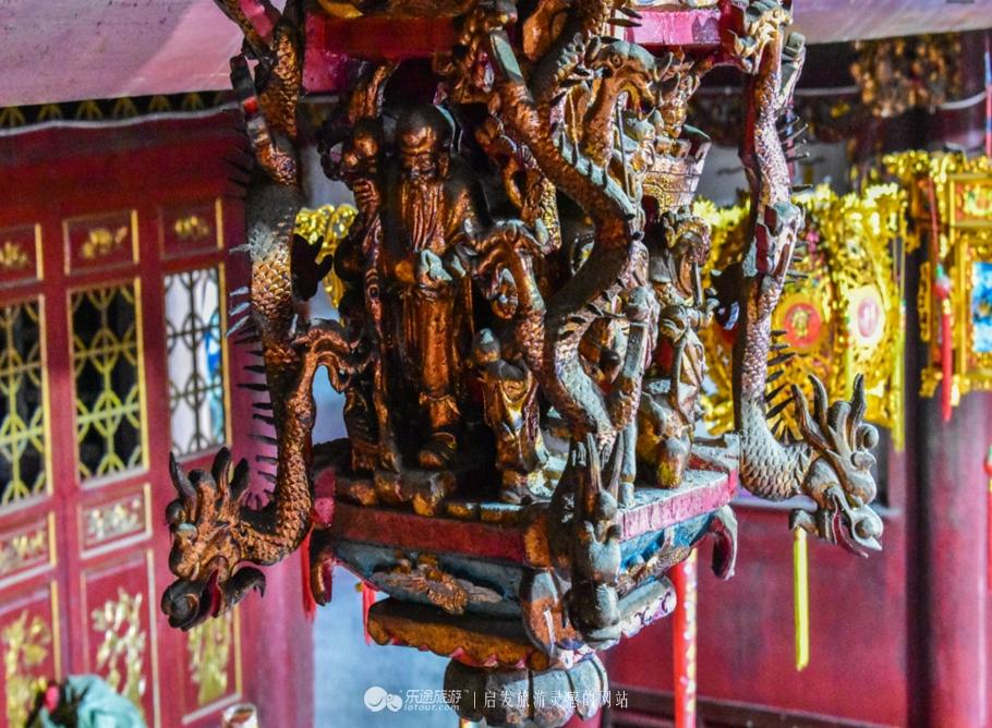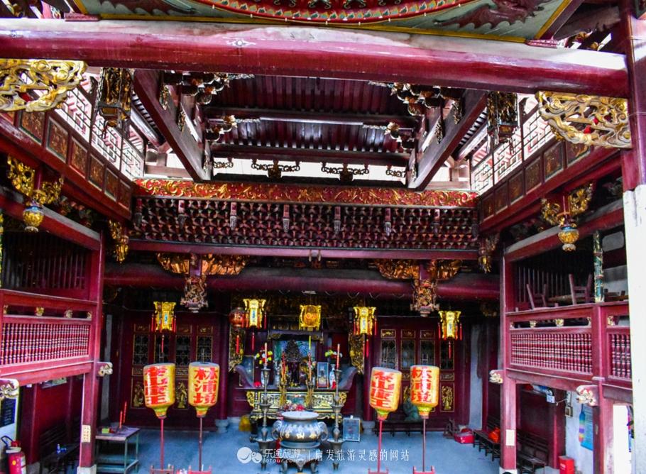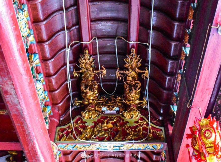 泰山宫大殿正中敬奉着端宗皇帝的神像,广王和秀王的塑像,也祭祀于左右,殿内抬梁式和穿斗式混合木构架颇具特色,翘角飞甍,雕梁画栋,飞禽走兽无不雕刻的细致精美,俨然一派古风犹存的情调。