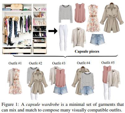 这篇论文作者设计了一个模型,给定一个待选服装和饰品的清单,胶囊用最少的物品组成物品集,而这个集合可以提供最多的混搭配备。模型使用目标函数进行基本的训练,而目标函数的设计是用来获取视觉兼容性、多功能性和用户特定喜好的关键因素。使用胶囊衣柜,可以轻松地从你的衣橱里找到符合你品位的最佳搭配。