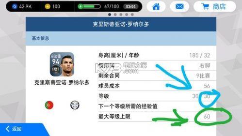 最大等级上限:球员所能达到的最大等级(图1,绿箭头所示)。球员达到初始最高等级后就不能再升了,想要达到上限,就需要突破限制。球探抽出的球员,最大等级上限30,经纪人抽出的最大等级上限50,特别经纪人抽出的最大等级上限60。