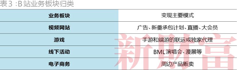 具体来看,迄今为止,B站尝试过的变现方式有很多种:内容页广告、游戏联运、线下漫展、演唱会、定制旅游、周边贩卖、新番承包计划、大会员制度等等,业务板块其实也随着商业化道路的推进逐步地拓展与完善(表3)。