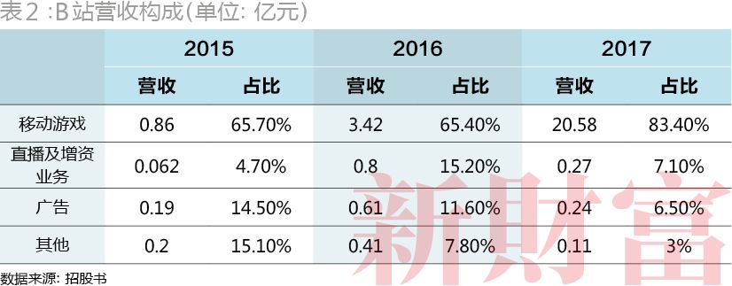 不过,作为二次元视频网站独角兽,B站的主要营收却并非来自互联网视频网站的主要盈利模式——广告、电子商务和会员收费;相反,B站目前的盈利切入点是游戏。而且B站经过近几年的商业化探索,已经慢慢从一个内容平台发展出了一条内容衍生的二次元产业链。B站招股书显示,其主要收入有移动游戏、直播、在线广告。其中2017年,移动游戏板块同比增长297.55%至20.58亿元,占比高达83.4%(表2)。直播和广告业务占比不到14%。