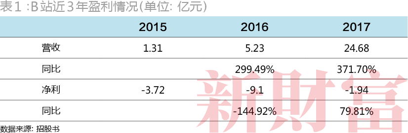 不过,虽然B站将A站甩在了身后、将率先登陆资本市场,但B站提交的招股书也揭开了它并不乐观的财务状况。招股书显示,2015-2017年,B站录得巨额亏损,在2017年净利润同比增长79.81%的情况下,仍然存亏损了1.94亿元(表1)。