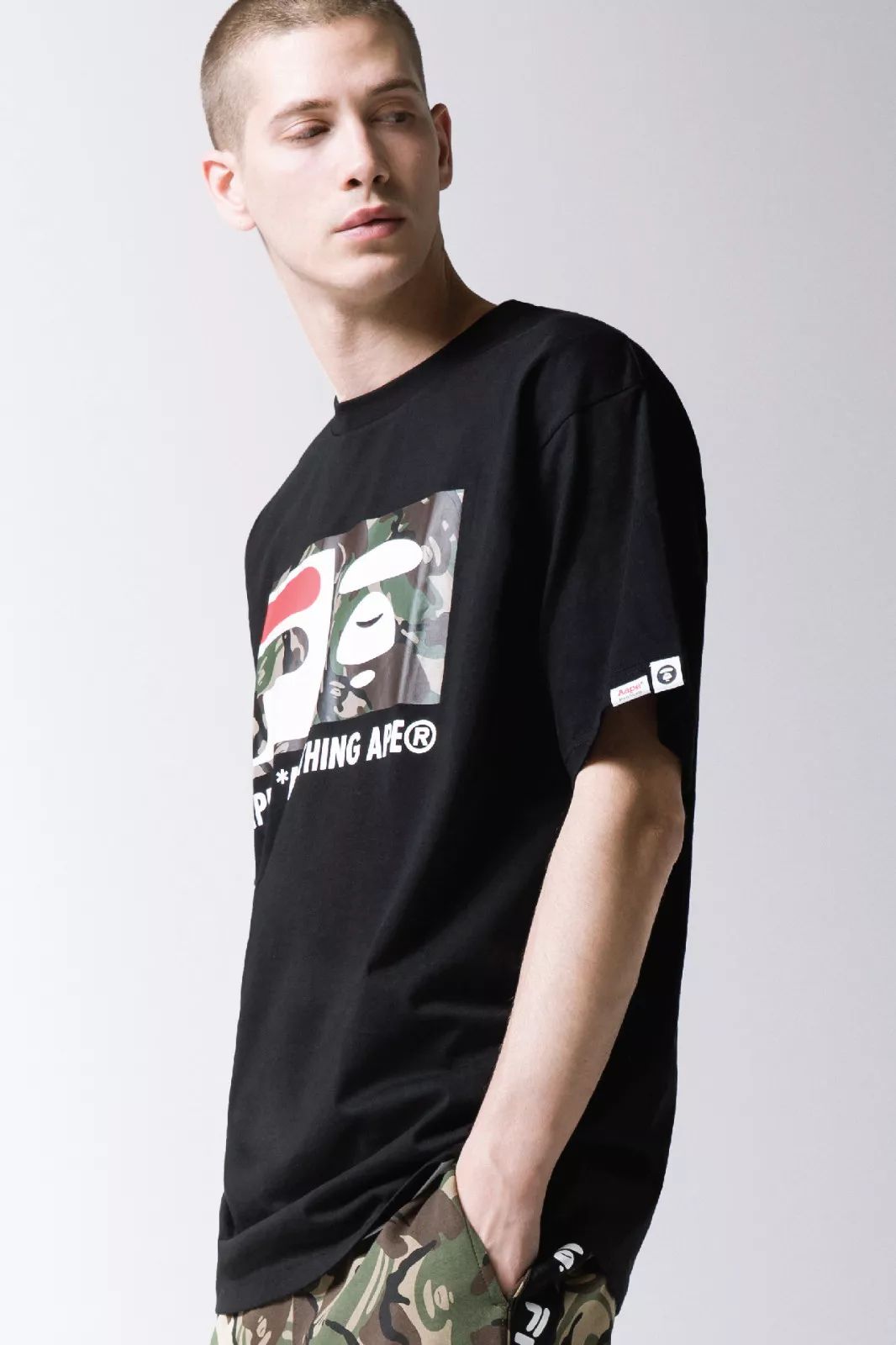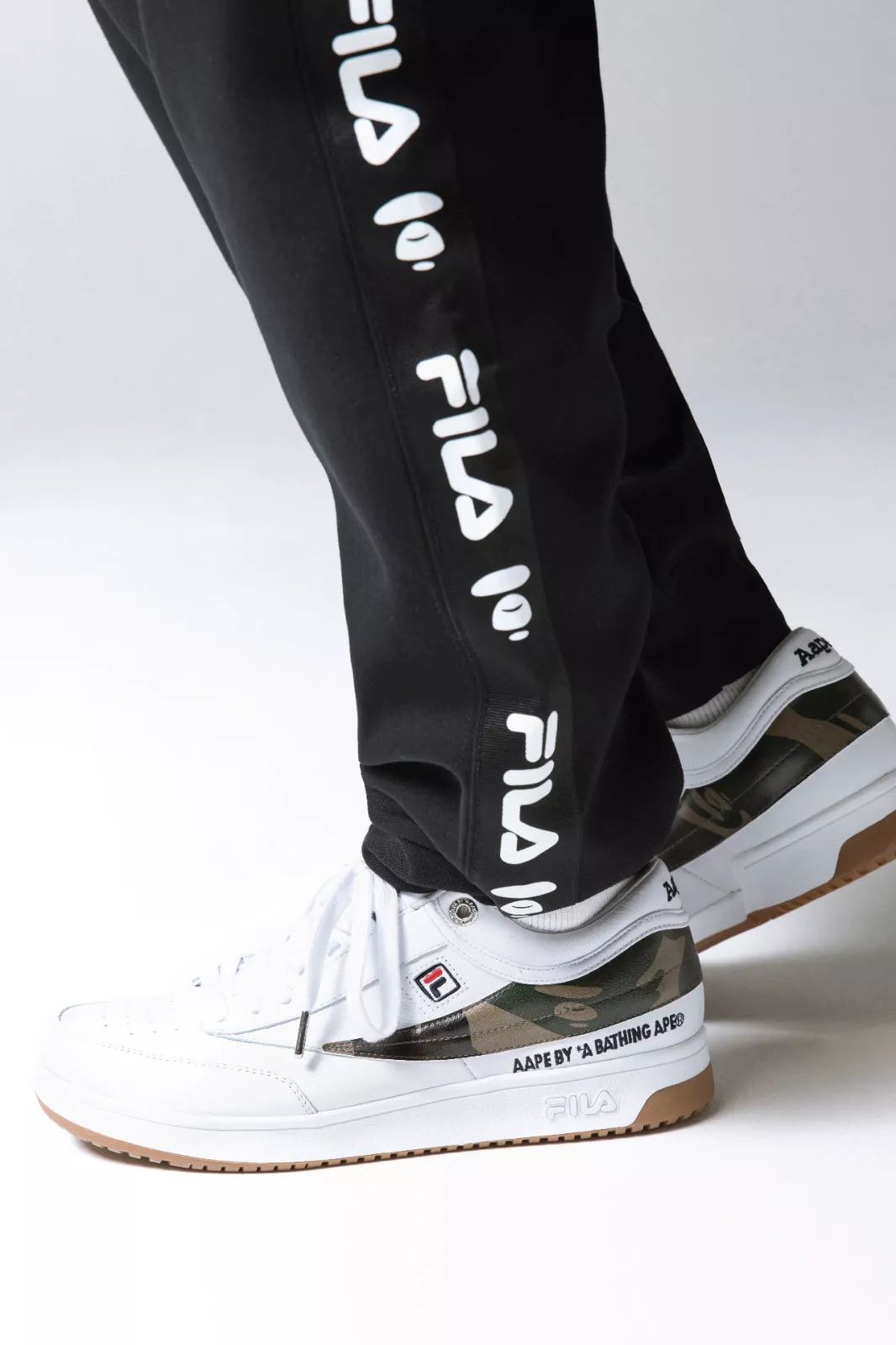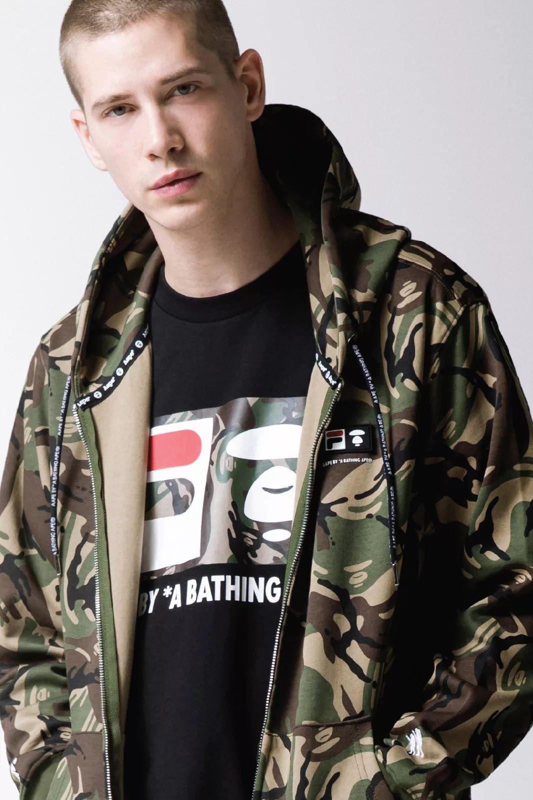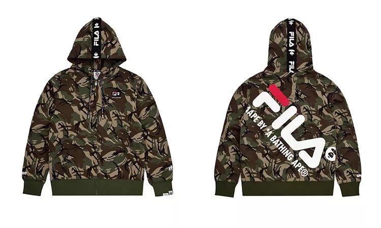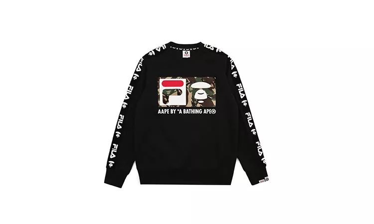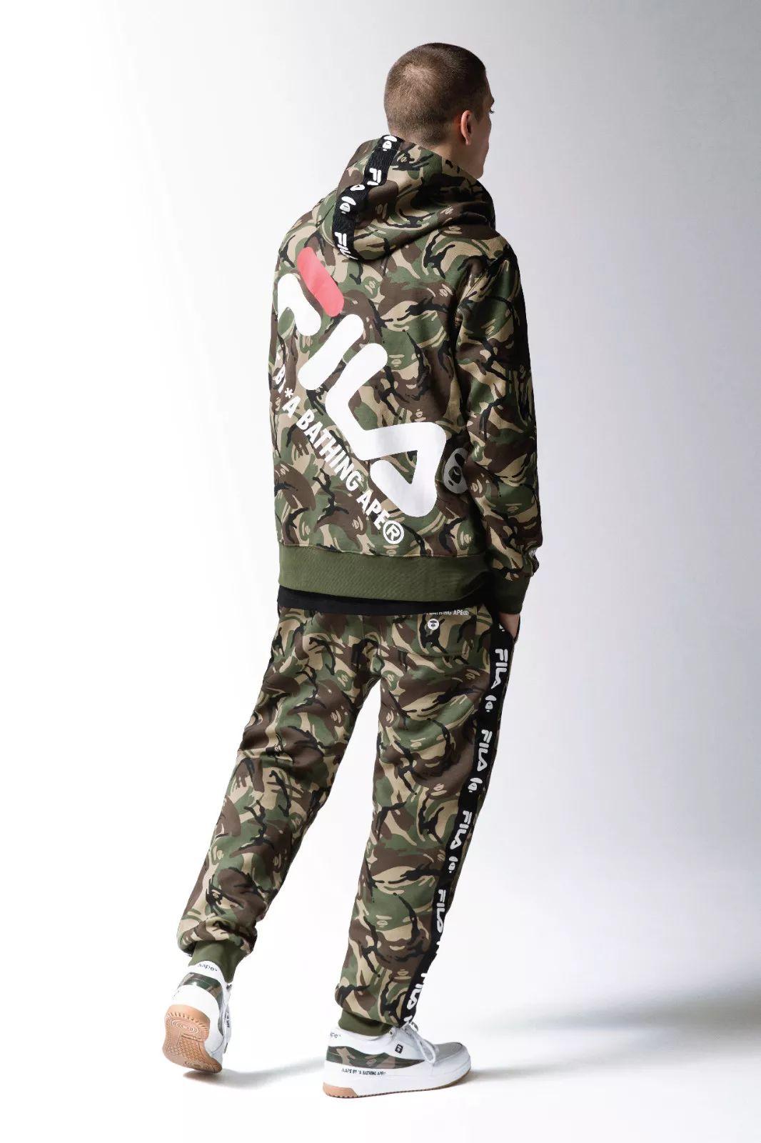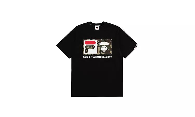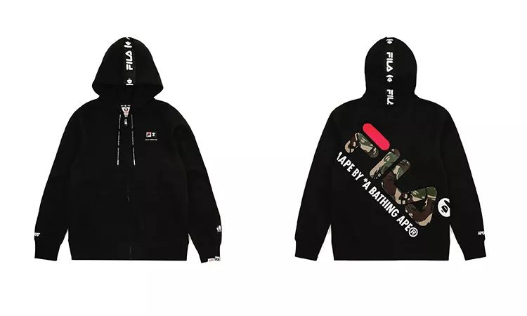 而此次联名的设计方面,最大化的彰显了两个品牌的特点特性,用AAPE象征性的迷彩融合FILA 运动元素,运用黑色当作核心,加入了双方的Logo,背后则搭配了硕大型的FILA品牌字样。