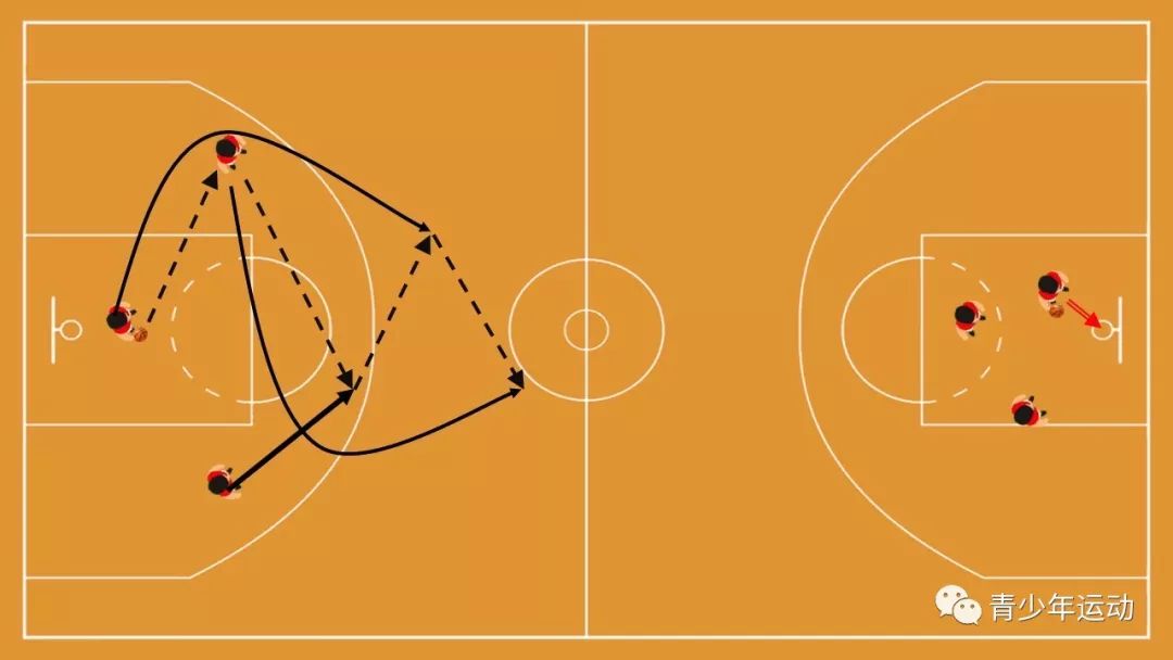 1、开始练习时慢速跑,短传球,以便理清跑动顺序与方法,必要时可以运球过渡