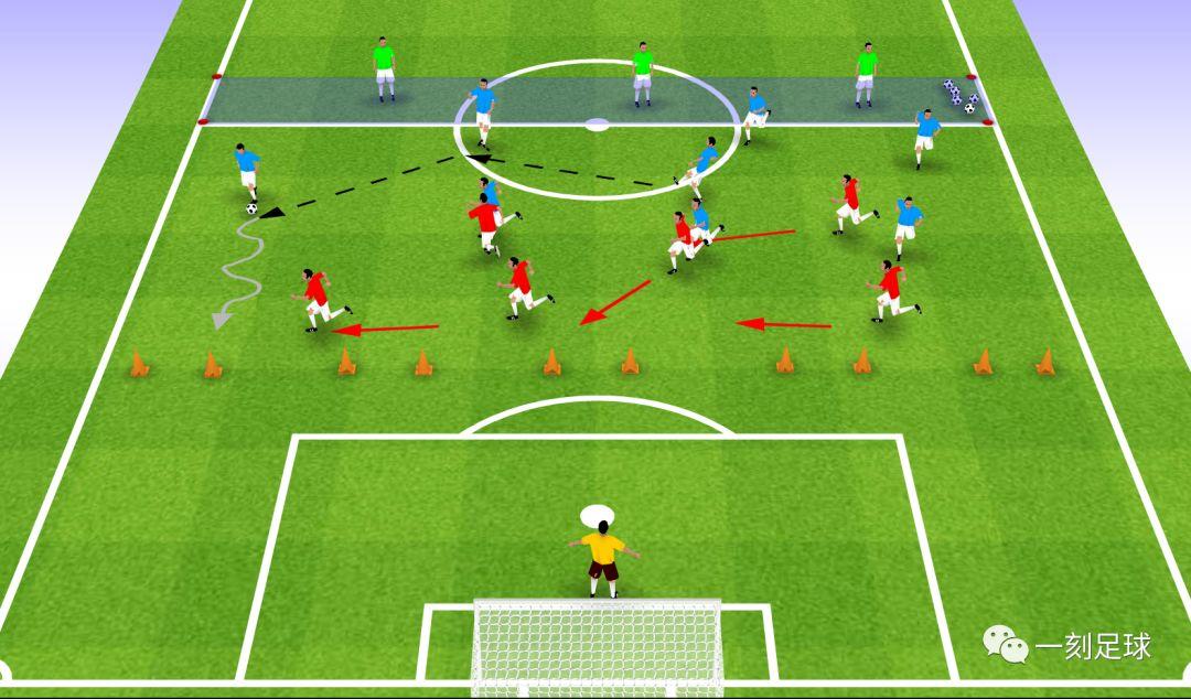 1. 球员在阴影区域内进行6对6比赛,设置7个小球门。