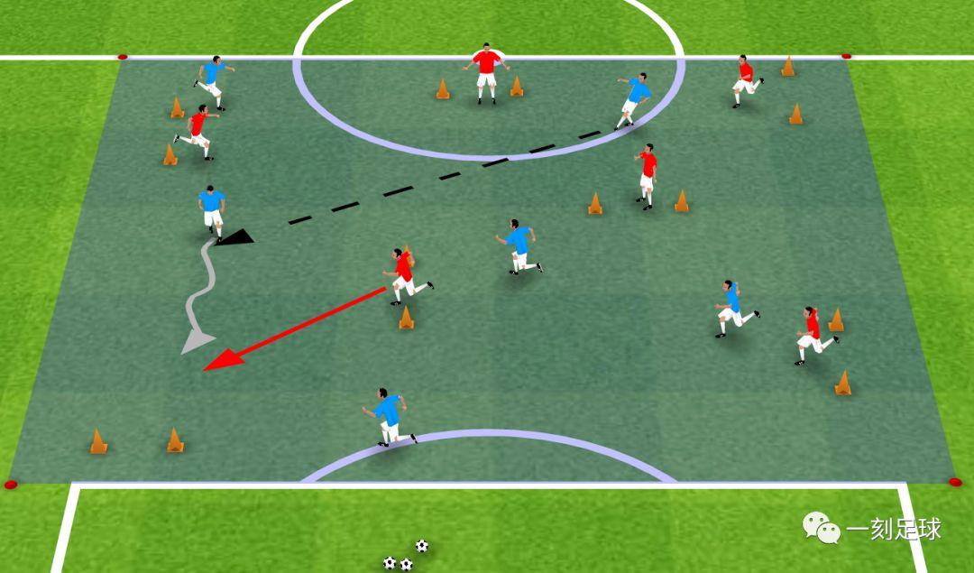 2. 进阶训练:蓝队球员站位与假人相同,蓝队互相传球,红队球员同样根据球的移动而移动,采取区域防守原则。当红队断球后,迅速拉开传球,争取连续传球10次。