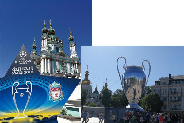 但只要你进入这座城市,就能感觉到欧冠决赛的浓郁气氛。街上随处可见穿着皇马或利物浦球服的球迷。你会发觉,只要是和自己穿着同一款球衣的人相遇,基本上都相视一笑。著名的索菲亚教堂前广场,树起巨大的银光闪闪“大耳朵杯”,与教堂和钟楼的金顶争相辉映。独立广场旁的大楼挂起了巨大的欧冠比赛足球……几乎每个广场,每个重要景点都立起了欧冠的宣传物料。