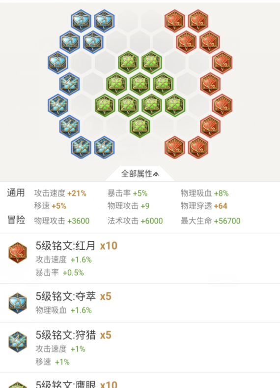 第二套是常规的AD为主的出装,在这里不多做介绍,主要说的是第一套攻速装备,可以提供的输出增益属性为60+20*3+100+50+15*3+200=515点AD,30%+30%+30%+35%=125%攻速加成,有心的读者可以算一下,前两套装备在AD加成方面区别并不是特别的多,只不过强势期不一样,一个是前中期强势,一个是前期和后期强势。个人常用铭文如下: