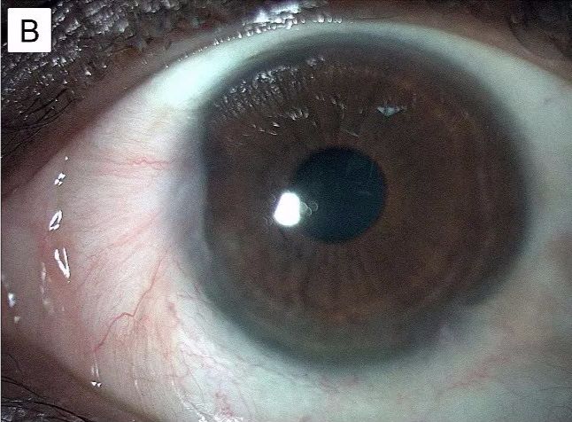 患者其后接受浅层角膜切除,移除了病变。角膜基质床用湿润羊膜移植物覆盖,图B显示了术后3周的恢复情况。