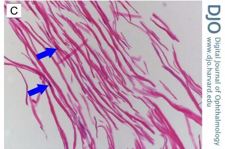 组织学检查显示,角膜胶原束间可见混杂排列的成纤维细胞(图C,箭头所指。HE染色,放大200倍),证实了角膜蟹足肿的诊断。