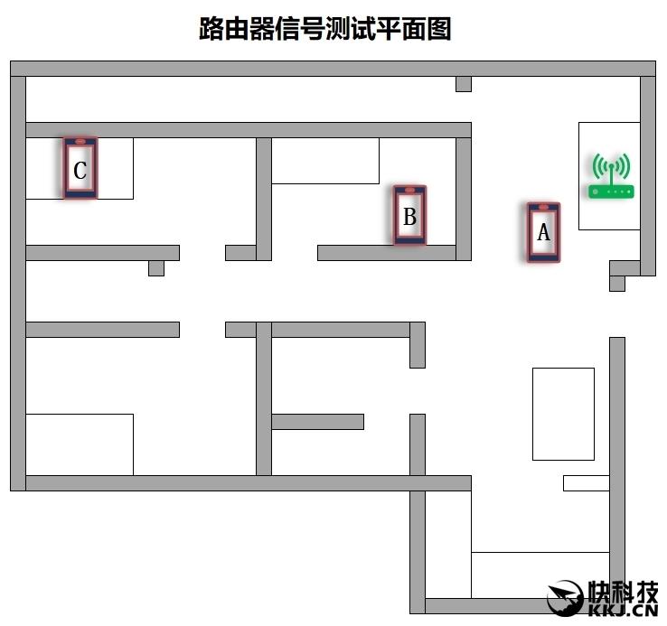 信号为依次顺序排列,A点信号最强,B点隔了一堵墙,信号略低,C点隔了两堵墙,信号更低,但即使是隔墙,依然能够稳定接收到Wi-Fi信号。