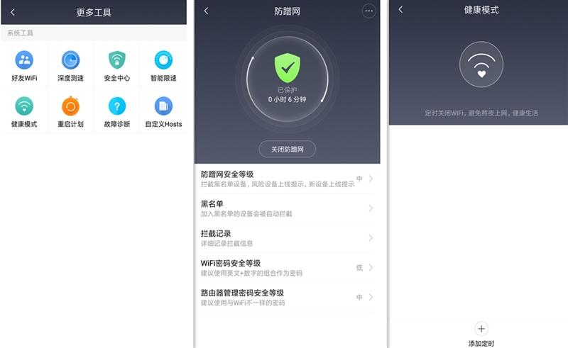除了一些控制网络功能外,APP里还能进行好友Wi-Fi、安全中心、防蹭网、健康模式等贴心小功能,由于篇幅过长,这里不再一一叙述。