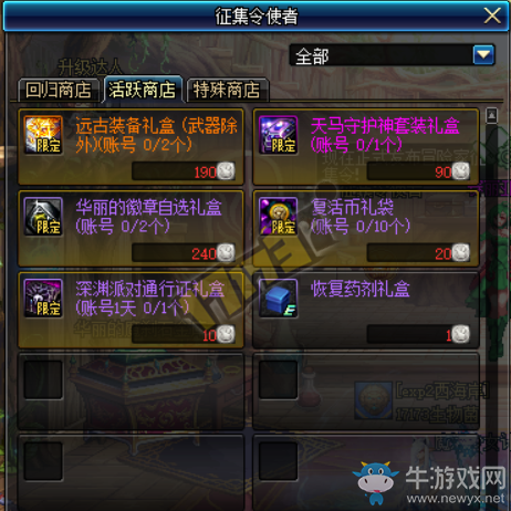 可兑换的有远古装备礼盒、天马守护神套装礼盒、华丽的徽章自选礼盒、复活币礼袋、深渊派对通行证礼盒、恢复药剂礼盒。