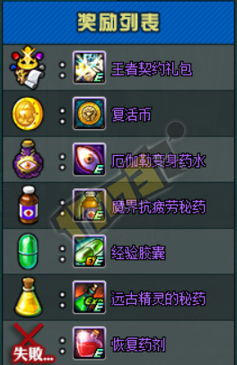 奖励有王者契约礼包、复活币、厄伽勒变身药水、魔界抗疲劳药、经验胶囊、远古精灵的秘药、恢复药剂。