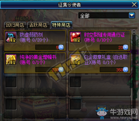可兑换的有防虚弱药剂、时空裂缝专用通行证、纯净的黄金增幅书、白金徽章礼盒(自选职业)