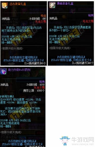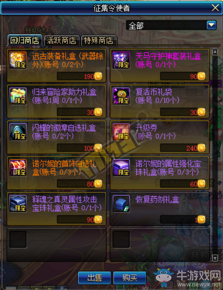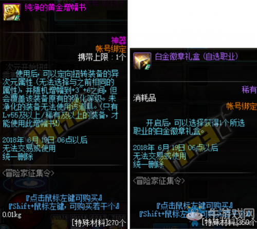回归用户与活跃用户组队时,可以通过推荐地下城获得“特殊材料”,使用该道具可以在特殊商店处兑换奖励。可兑换的奖励有防虚弱药剂、时空裂缝专用通行证、纯净的黄金增幅书、白金徽章礼盒(自选职业)。