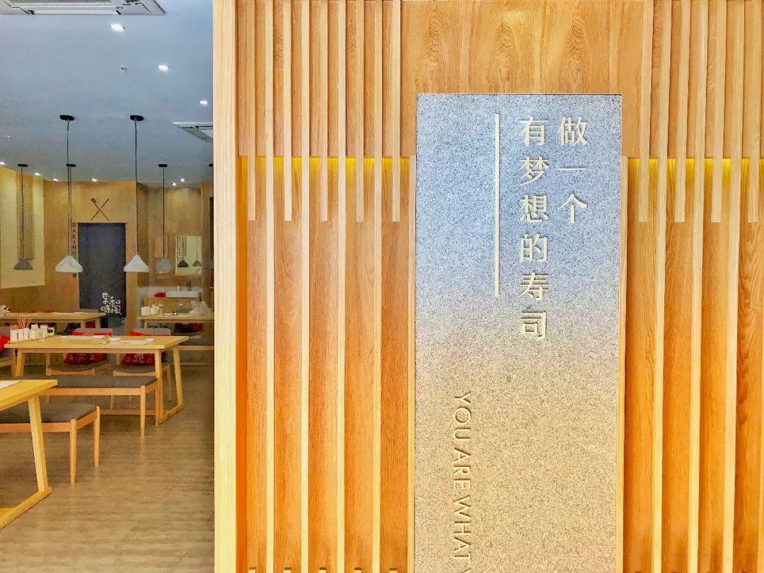 原木色的布置透着暖暖述说的温度,细节处也看得出经营者的用心。菜单用原木雕刻挂在墙上,最过目不忘的是墙上那一句:“做一个有梦想的寿司。”