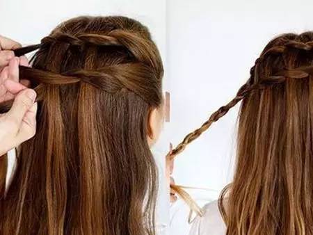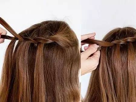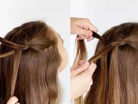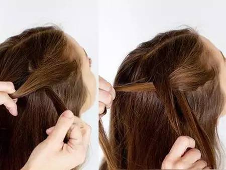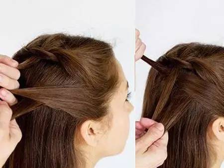 2.在编至第二个“麻花”的时候将一股头发散下,然后另外抓取同样发量的一股继续编下去。