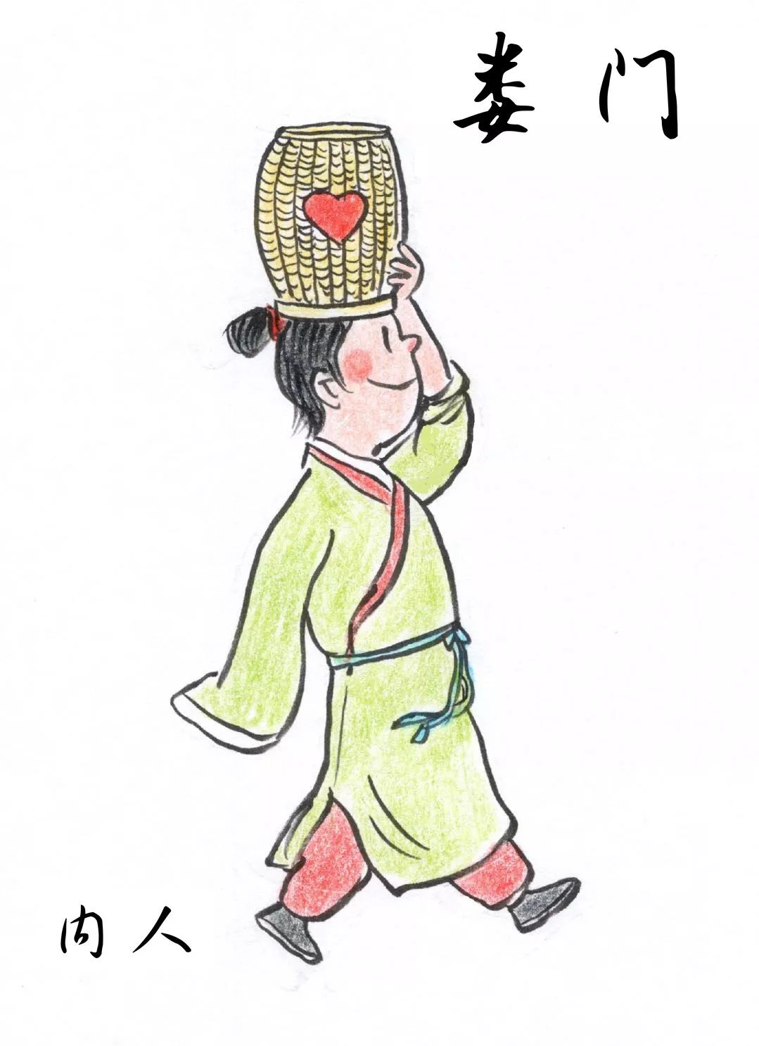 夫君早晨出城门做工,夫人中午作好饭食,头戴竹编的娄,哼着歌儿,与同行的人一路欢笑,出城送饭。
