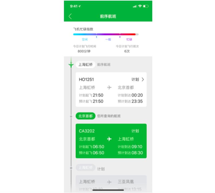 它会完整显示这家航班一天内飞行的完整路线,以 29 日要飞行的 CA3202 次北京- 上海航班为例,这一天它会飞 6 个航班,先从上海飞到北京,再飞往三亚、珠海、最后回到上海。这时候如果发现你要乘坐的之前的航班,也就是上海- 北京的班次已经出现晚点,意味着后面的 5 个行程都有极大可能延误。