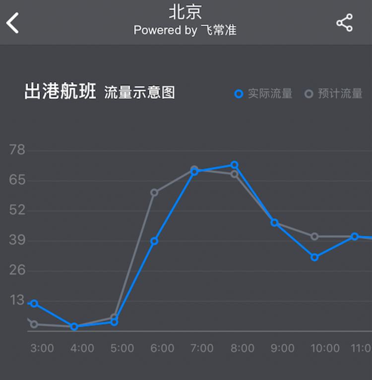 飞常准有更加可视化的界面告诉你机场繁忙程度,是否有大面积延误,以及机场当日流量的折线变化图。
