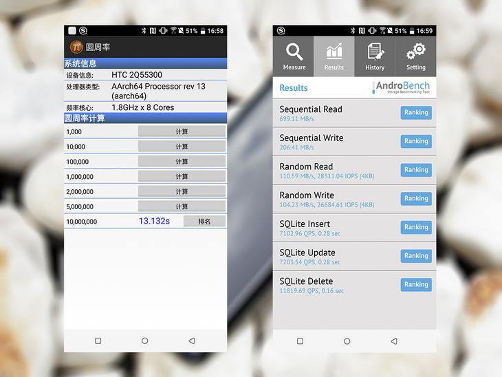性能方面,HTC U12+采用高通骁龙845芯片,实测安兔兔跑分在25万分左右,Geekbench单核得分2403分,多核得分8807分,圆周率π计算到1000万位用时13.132s,总结来看就是U12+的性能是正常水准。在内存以及存储方面,U12+采用LPDDR4x内存配UFS 2.1存储,从实测来看顺序地区速度为699MB/s,也是处于旗舰机的正常水准。