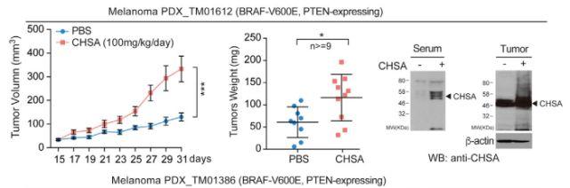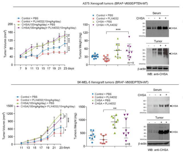 上:BRAF V600E突变肿瘤小鼠,可见CHSA组明显肿瘤生长速度较快