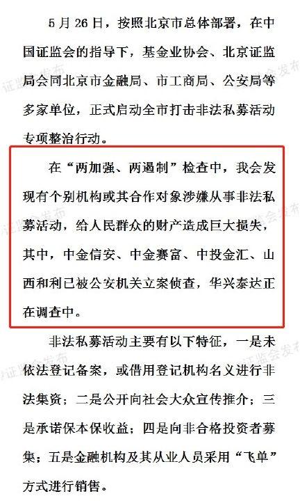 值得一提的是,2015年上半年,证监会发布,在“两加强、两遏制”检查中,发现有个别机构或其合作对象涉嫌从事非法私募活动,给人民群众的财产造成巨大损失。其中,中金信安、中金赛富、中投金汇、山西和利己涉嫌从事非法私募活动被公安机关立案侦查,华兴泰达正在调查中。