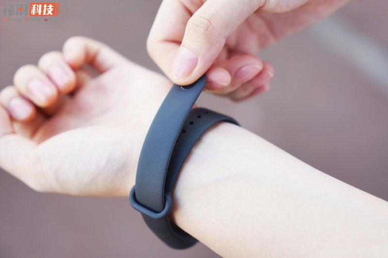 腕带与手环主体正面基本衔接在一起,两者之间也没有明显的分离感。需要注意的是,小米手环3无法从正面(外侧)与腕带分离,而需要从手环背面(内侧)并用点巧力进行分离。换言之,正面无法分离的情况下,可以有效地避免了手环主体不慎脱落。