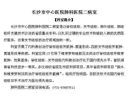 蒋之主任表示,若确诊为骨结核,请及时到有资质的结核专科进行治疗,长沙市中心医院肺科医院二病室是治疗骨结核的专科,独特的影像定位椎旁注射药物治疗脊柱结核,仅凭医生手中一根小小的穿刺针,便能准确定位进行椎旁抽脓注药,对患者来说,手术创伤小、痛苦程度低、安全可靠,可以在最大程度上保留患者脊柱的功能,临床痊愈率高,容易被患者及家属所接受。