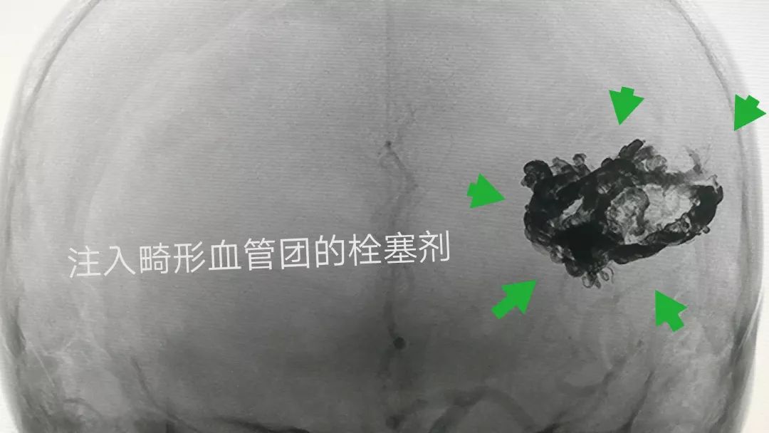 畸形团内注入的栓塞剂清晰可见(下图)