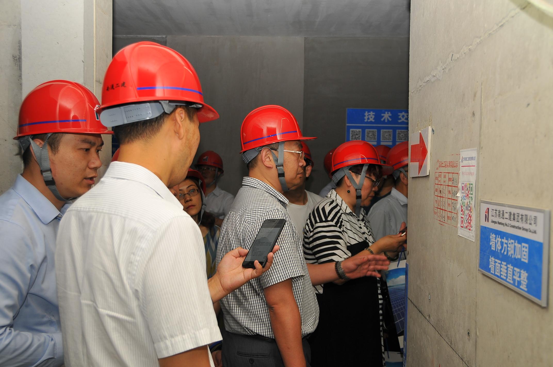 随着参观团走进工艺展示区,多项创新工艺吸引了观摩团的注意:半构造柱墙体收缩补偿做法、砌体免开槽工艺、室内薄抹灰工艺、临电线路墙内预埋做法、外墙的企口做法 、外墙真石漆批刮改良型做法等建筑质量通病防治措施,不但保证了项目的建筑质量,也体现了绿色、环保施工。