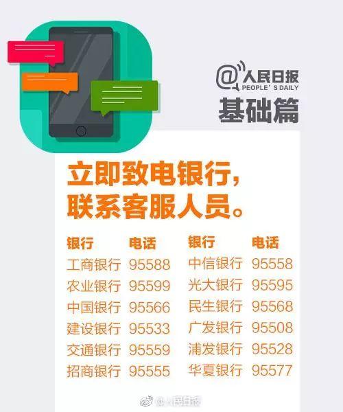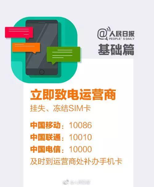 ①致电手机运营商挂失手机号;②致电银行挂失银行卡;③手机绑定支付宝的,拨打95188挂失;④微信用户登录110.qq.com冻结账号;⑤向派出所申报丢失补领身份证;⑥到手机运营商处补手机卡。转发提醒!