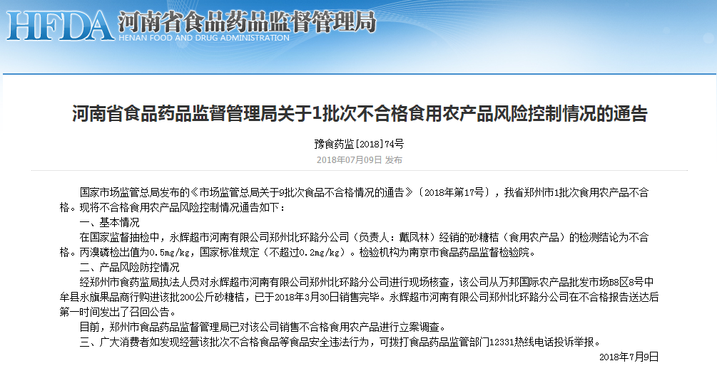 7月9日,河南省食药监局公布了1批次不合格食用农产品风险控制情况的通告,国家市场监管总局发布的《市场监管总局关于9批次食品不合格情况的通告》(2018年第17号),河南郑州市1批次食用农产品不合格。永辉超市河南有限公司郑州北环路分公司经销的砂糖橘(食用农产品)的检测结论为不合格。丙溴磷检出值为0.5mg/kg,国家标准规定(不超过0.2mg/kg)。检验机构为南京市食品药品监督检验院。