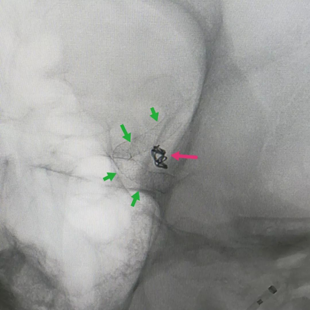 而且两个动脉瘤同时治疗难度和风险增加。所以我们采用了目前最先进的密网支架技术,既能保证重要血管通畅,又能彻底治愈动脉瘤。手术后可见支架完全贴合血管壁(下图绿色箭头)