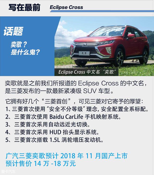 提到三菱,你可能都叫不出来几款车名,欧蓝德、帕杰罗、劲炫、Lancer……,在国内竞争如此激烈的市场,三菱显得有些过于低调。作为日本第五大汽车制造商,三菱的能力绝不止于此,于是有些“后知后觉”的它,终于要推出新车型了。这款新车是我第二次接触,而上一次它还叫Eclipse Cross,这次它有了中文名字——奕歌。