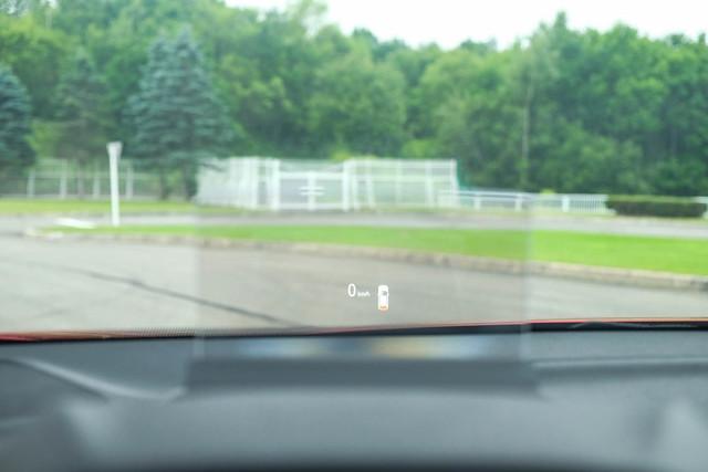 当启动车辆后会自动升起前方抬头显示屏,目前屏幕里只会显示时速、自适应巡航、预碰撞车道偏离的图标警示,三菱官方称量产车也可显示导航信息。
