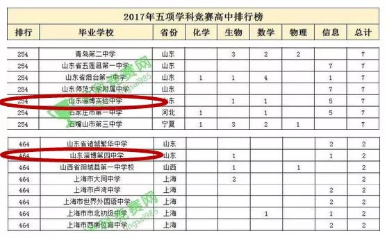 该榜根据各高中2017年获五项竞赛“省一”总数排序,总数相同的情况下名次相同。共有800余所中学入榜,其中淄博入榜了2所学校