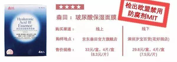 其中森田和珀薇2个品牌3款面膜产品被检出含有欧盟禁用的甲基异噻唑啉酮,浓度大于定量浓度13ppm,分别为49ppm、54.7ppm和63.7ppm,但都在国标要求的的限值100ppm范围内。