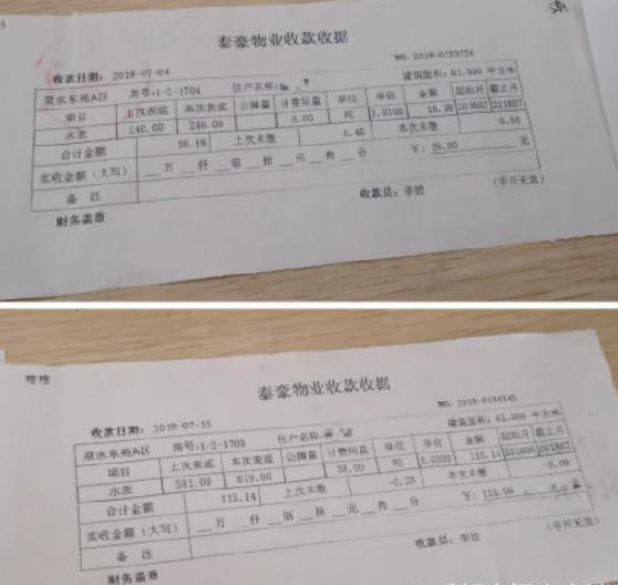 “让她们补交的1000多元水费,每个月都有单据,有底数存证。”吴鹏向记者解释这1000多元水费差额的计算方法,根据泰豪物业工作人员出示的《成都泰豪物业业主接房流程单》显示,3号和4号水表的原底数分别为1吨/2吨。截止2018年6月,现水表底数分别为619吨/246吨,用水吨数相差为374吨,按照每吨2.98元计算,差额为1114.52元。“这是一个很简单的道理,你多用了水,少交了钱,根据《民法通则》第92条,这叫不当得利。不管是因为我们的过错也好,还是疏忽也好所造成的,但是你确实不当得利了,有义务返还。”