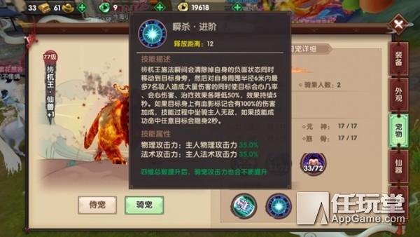 由于凡品和中品骑宠的属性限制,一般只是用于过渡,这里就不在介绍。上品骑宠中,穿山甲是非常适合御剑游侠仙职的;其能增加移动速度的金光技能和忽略物防、增加力量和生命的秘法技能尤其适用于御剑游侠追杀残血敌人以及自身逃跑。极品侍宠中,新出的梼杌王则是为御剑游侠量身定制的*杀暗**良驹;其可以瞬间移动到目标身旁的瞬杀技能和增加生命、物法双防、减伤的秘法技能,就足以让脆皮的法师胆寒了。下面,我们就以梼杌王为例,看看御剑游侠在战斗中如何与骑宠配合杀敌。至于怎么获取,仙友们在游戏里查看图鉴就知道啦。