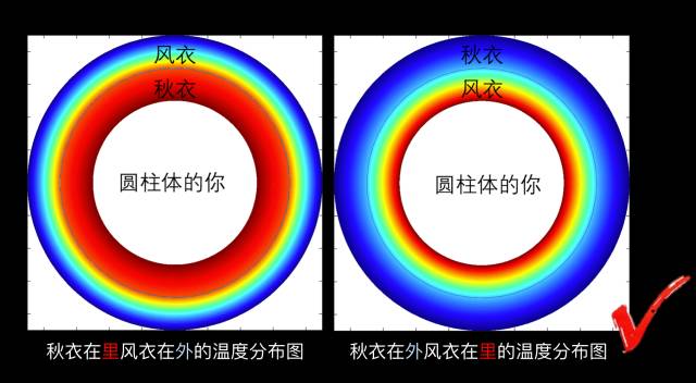 经过计算发现,当你把秋衣穿在外面,把风衣穿在里面的时候,你的散热功率比“秋衣在内风衣在外”的穿法小了整整2W。