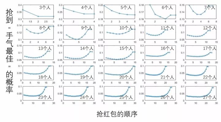接着,又给自己发了两亿个红包,得出的结论:抢红包的人比较多的时候,越往后往往抢到手气最佳的概率越大。
