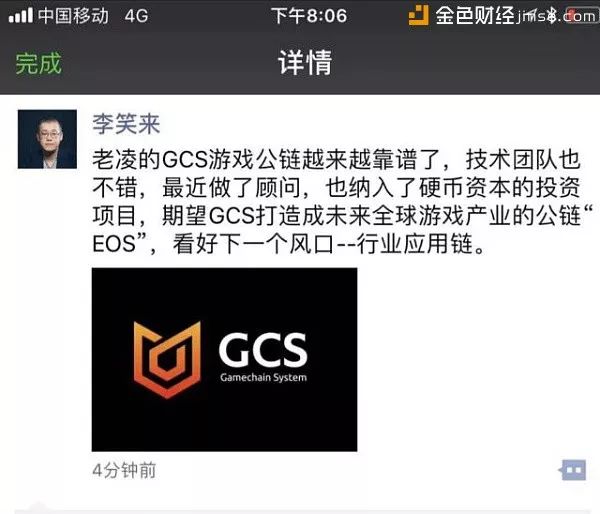另有代号为GCS的Gamechain System (中文:游戏链,代号:GCS),是一个着眼于全球游戏行业应用区块链技术的底层公链,并得到李笑来的站台,其亲自在朋友圈发文力推GCS。