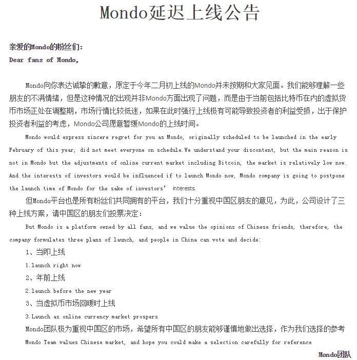 2月4日,Mondo团队发布公告称,受到全球监管风的影响推迟了项目上线,称十分重视中国区用户的意见,并提供了3种选择,一是当即上线,二是年前上线,三是当虚拟市场回暖时上线。