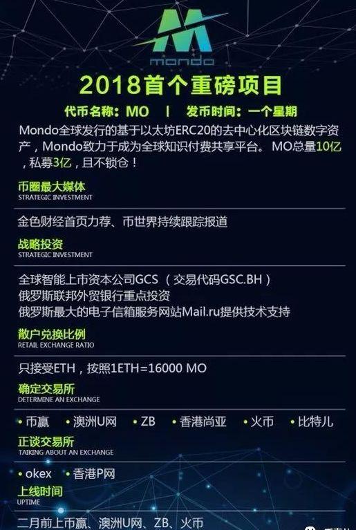 包装完成的Mondo,宣称可代币“MO”将登陆币赢、澳洲U网、ZB、香港尚亚、火币与比特儿等平台,同时在谈的交易所还有okex与香港P网等。其中,币赢、澳洲U网、ZB与火币将在2018年2月前上线交易。